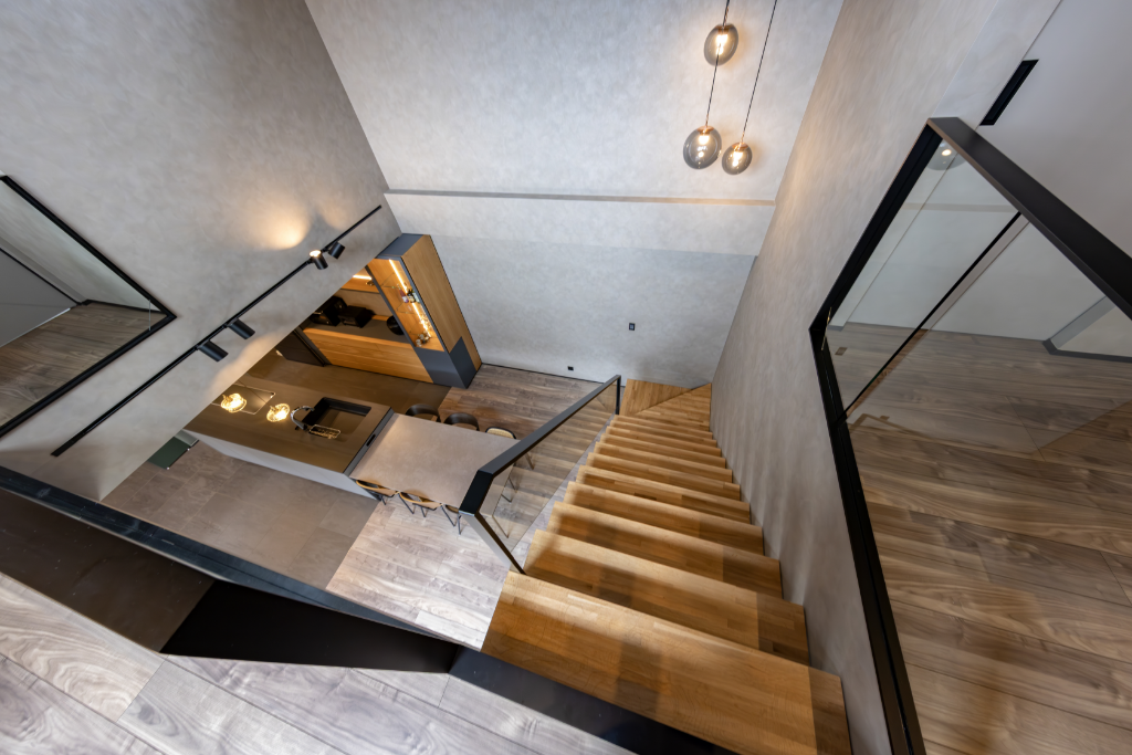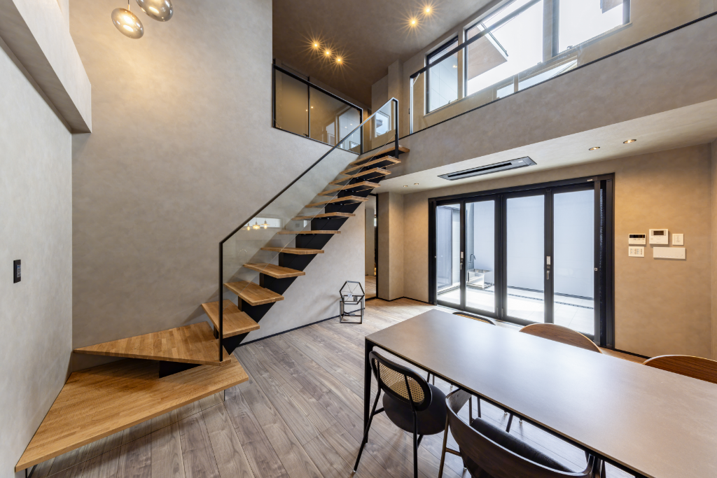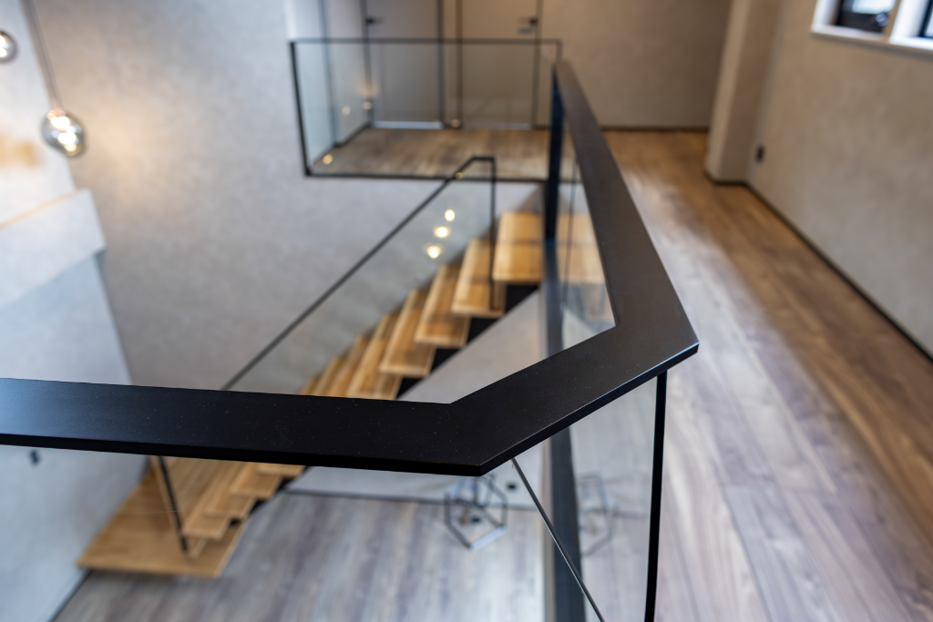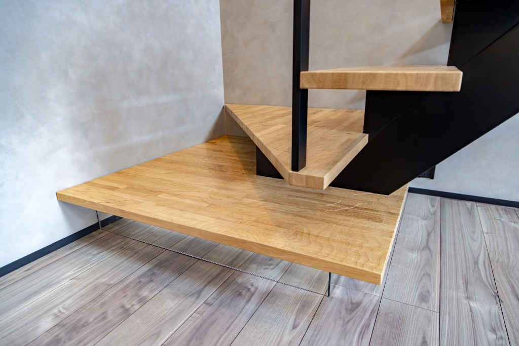 階段の踏板には海外の地形図をモチーフにデザインされており家具屋さんならではの仕上がりになっています。