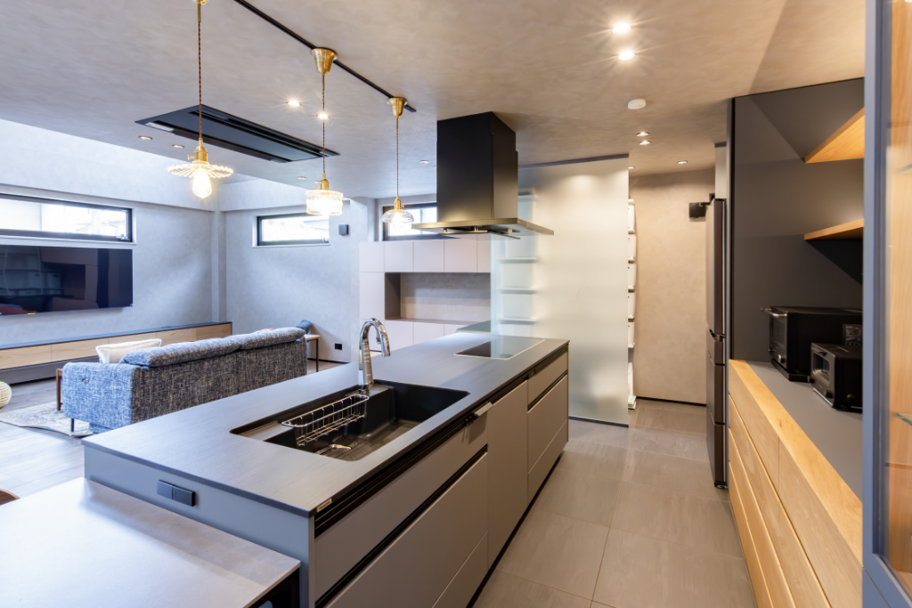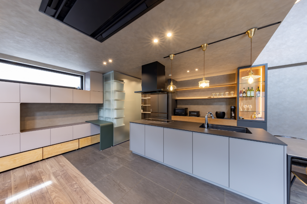 階段の踏板には海外の地形図をモチーフにデザインされており家具屋さんならではの仕上がりになっています。KTカップボードや洗面化粧台も奥様自身が設計や施工に携わり、奥様自ら塗装されました。