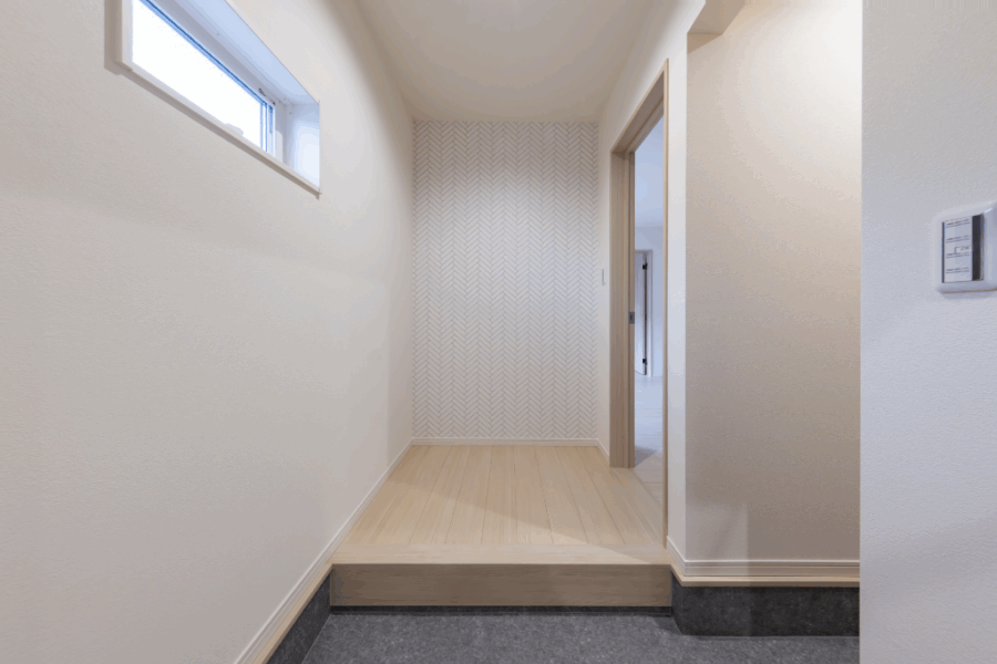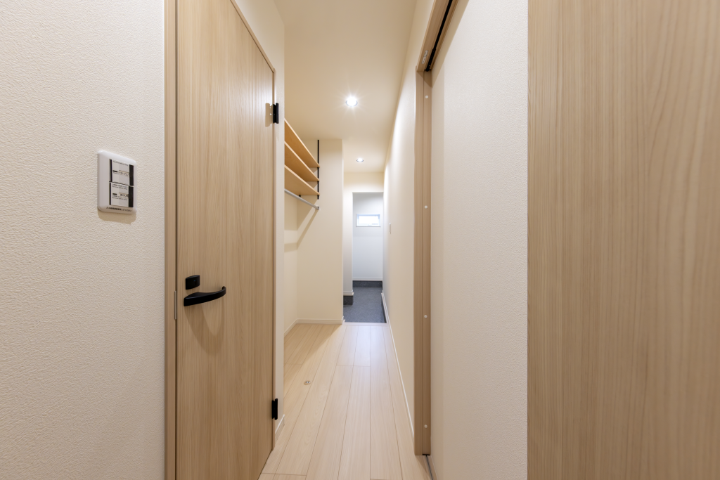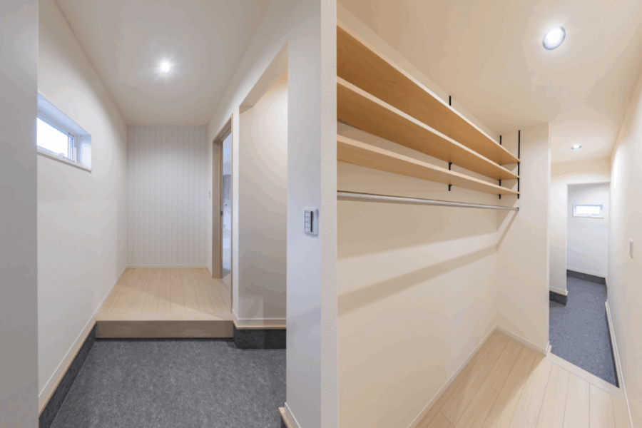 玄関 → シューズクローゼット → ファミリークローゼット → LDK と続く、