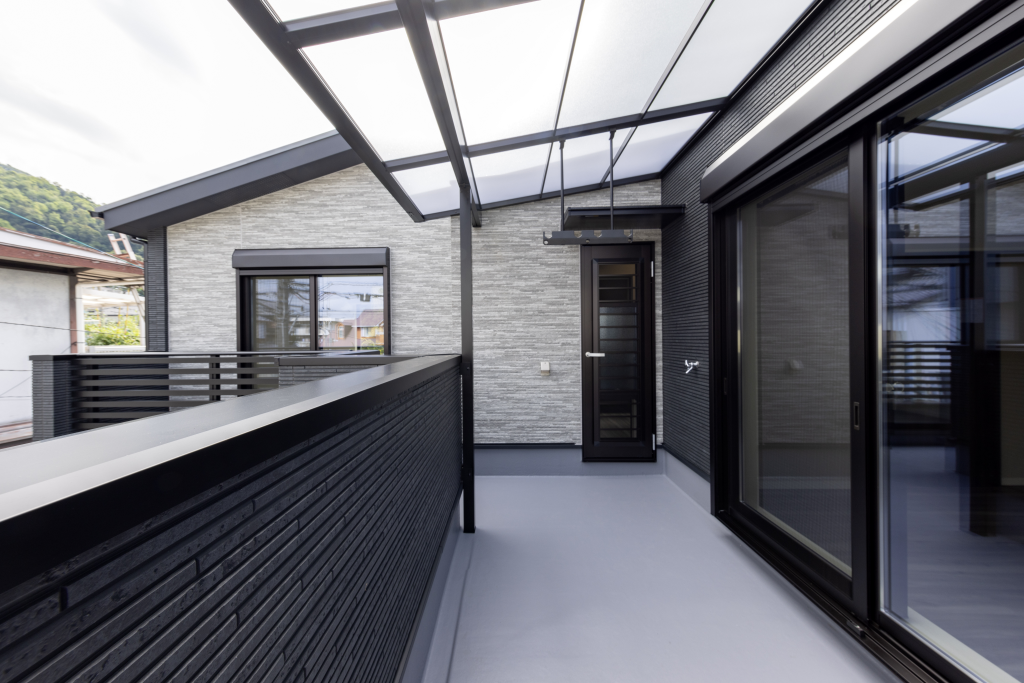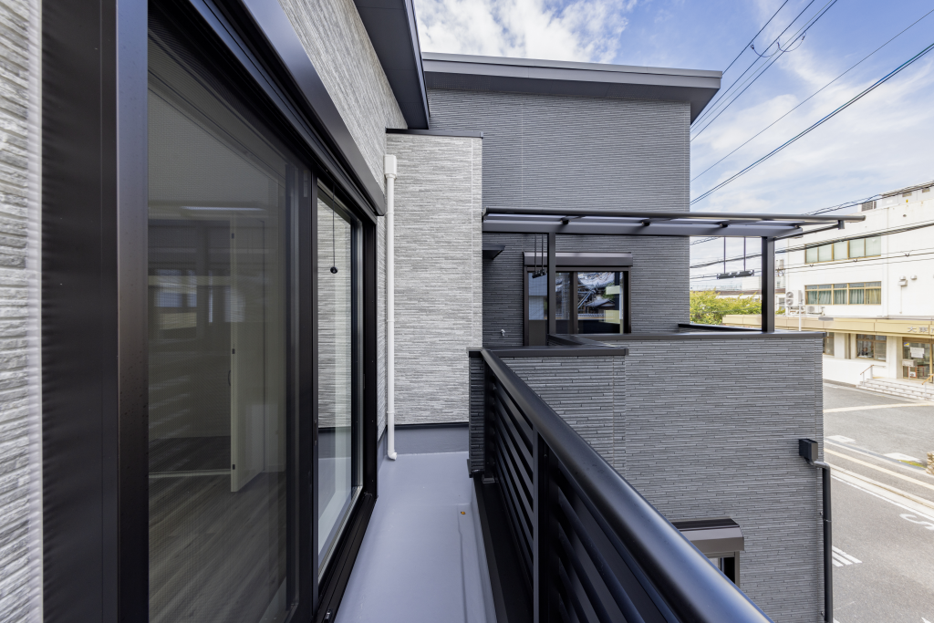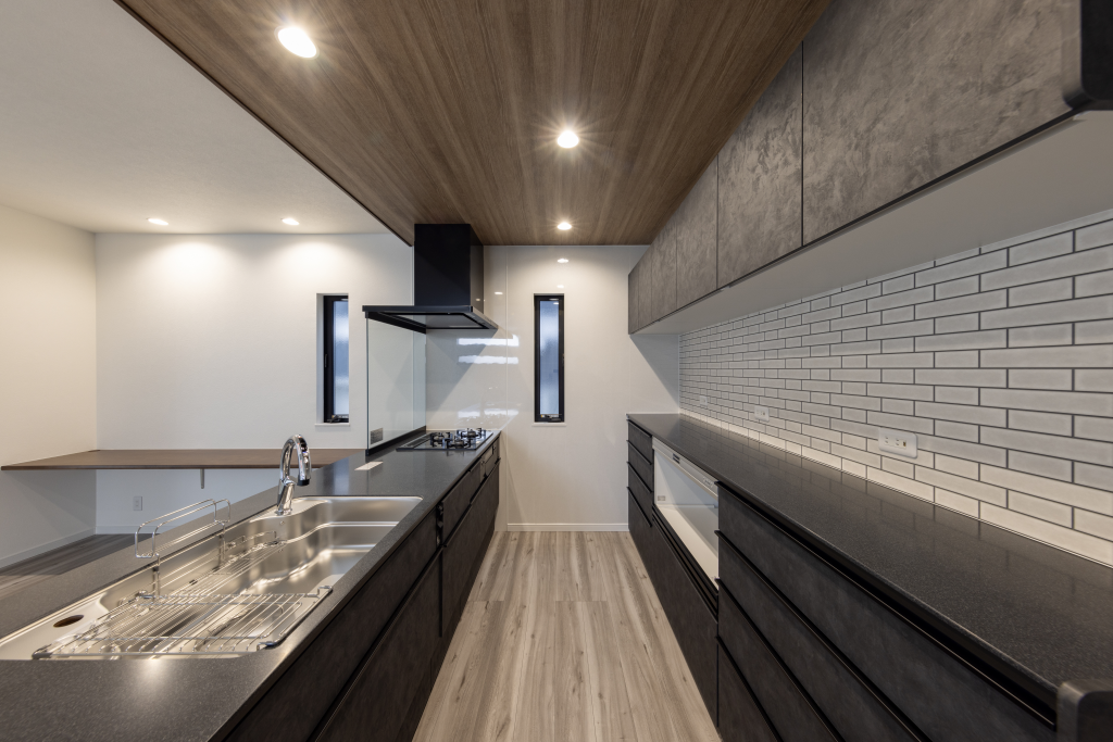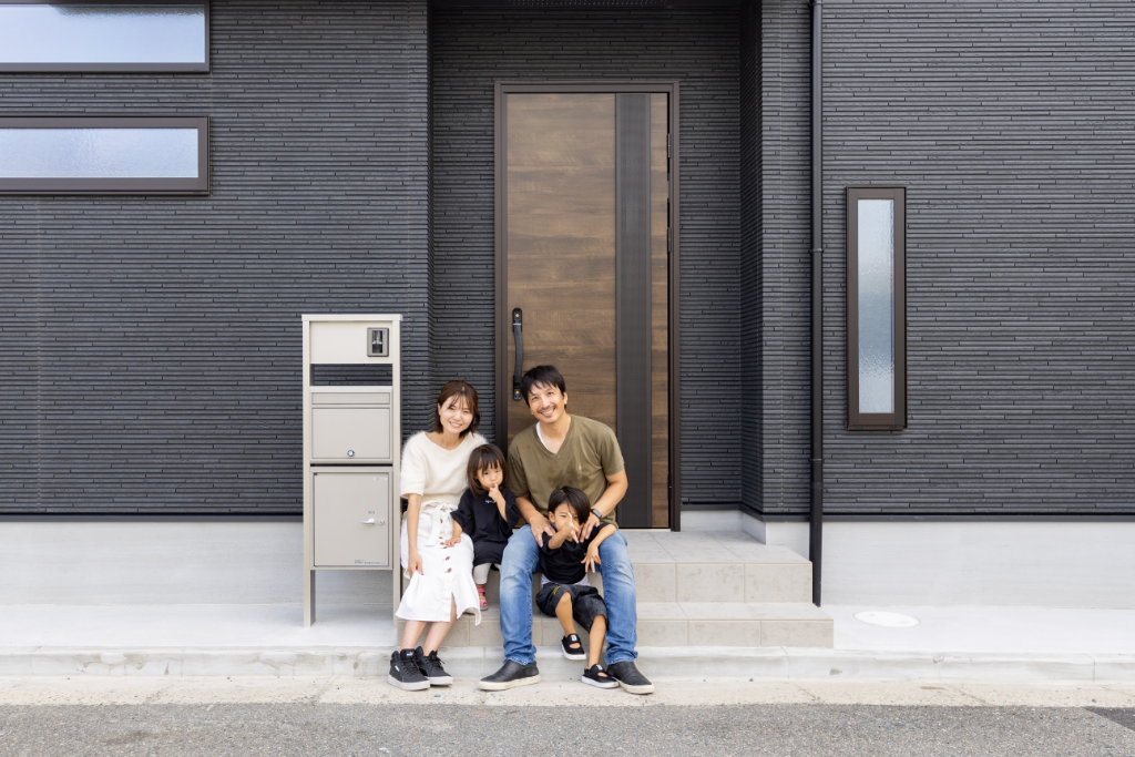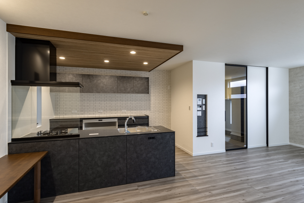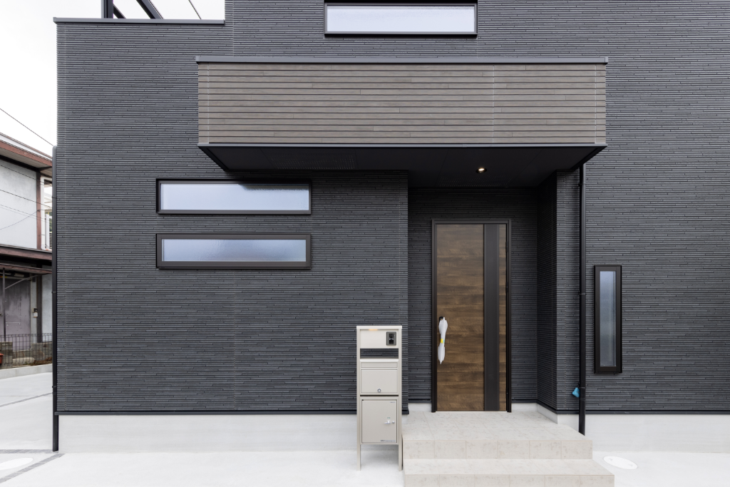 外観は施主様のご希望に合わせて、ブラックを基調にグレーと木目ブラウンをアクセントとして組み合わせ、