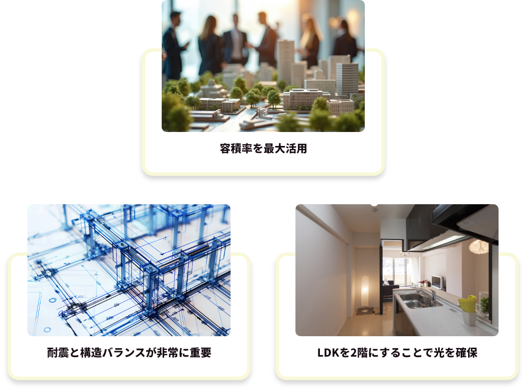 都市部では建ぺい率・容積率・斜線制限などの制約があるため、事前に「その土地で何階建てが可能か」を専門家が見極める必要があります。