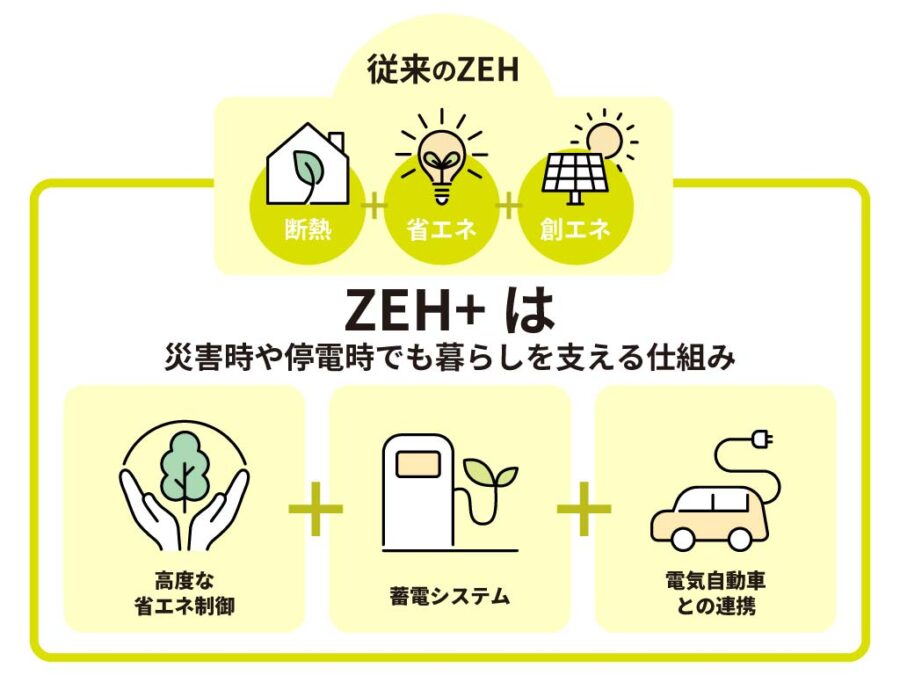 ZEH+ではこれに加えて、「高度な省エネ制御」や「蓄電システム」「電気自動車との連携」などを含み、災害時や停電時でも暮らしを支える仕組みが強化されています。