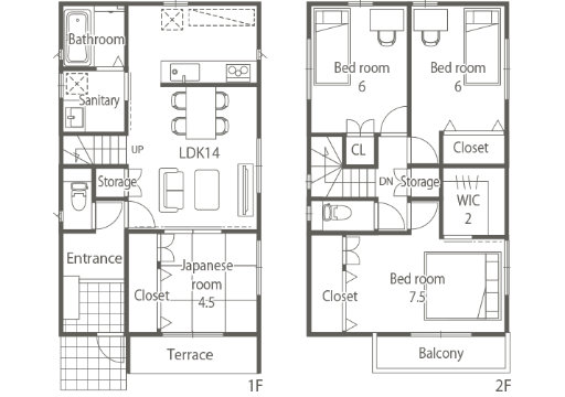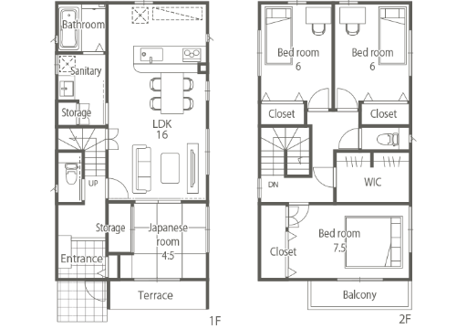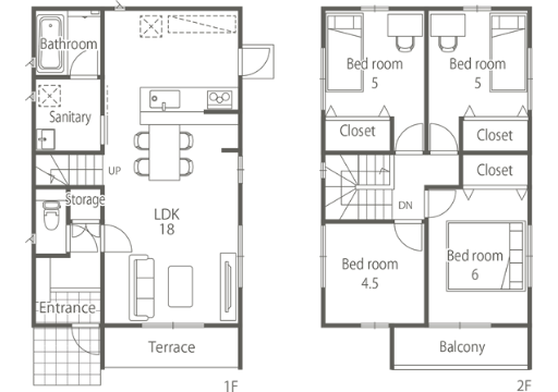 高い機能性と空間効率を極限まで追求したプラン。廊下をなくして有効面積を広げたLDKは二面採光で明るく快適、キッチン横には水回り機能を集中させてコンパクトな家事動線を実現。収納に配慮した2階の各居室は、ホールからすぐに出入りできる便利さがうれしい設計です。