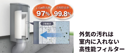 花粉などの微粒子を通さない2重構造のフィルターを搭載。2.0㎛以上の微粒子を97%除去し、きれいに浄化されてから室内に入ります。