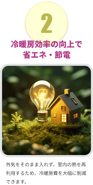 その結果、冷暖房効率が上がり、省エネで快適な空気環境を一年中維持できる仕組みです。