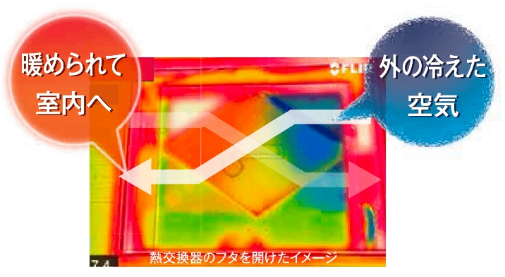 外から入る空気と、室内から出る空気が本体内部で交差し、熱と湿度だけを交換することで、